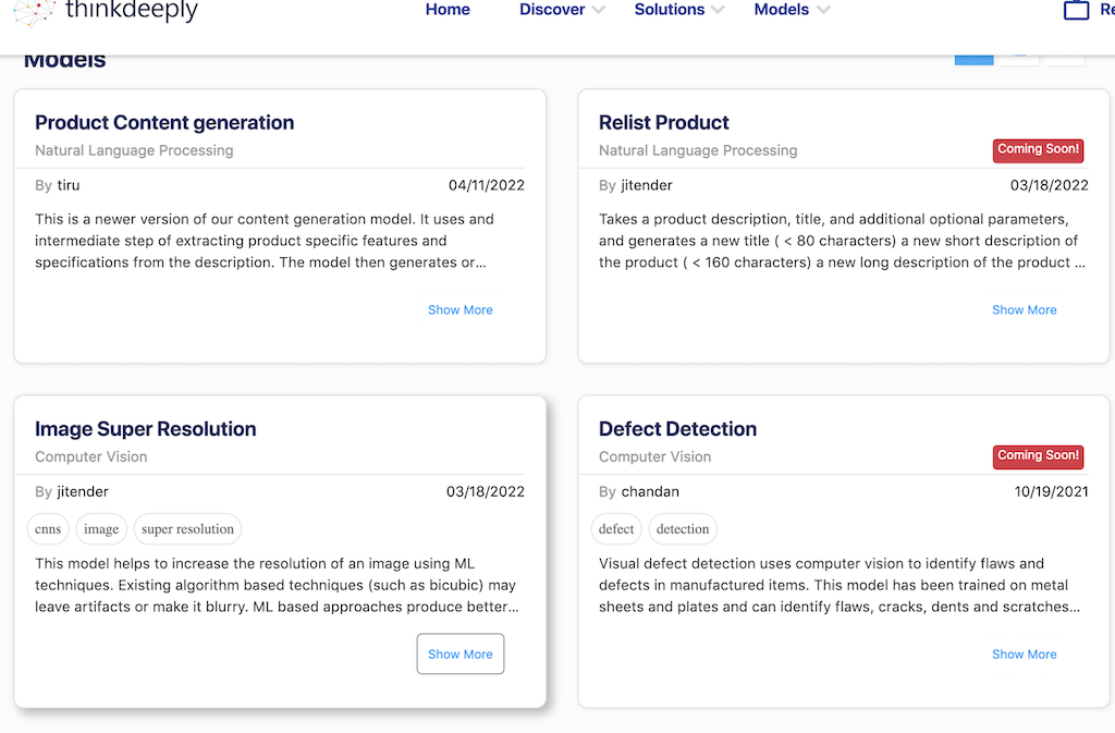 Thinkdeeply provides a generic model Serving Environment. This model serving contains several pre-trained models. There are several ways these models are sourced. These models provide an interface for quick evaluation of models.